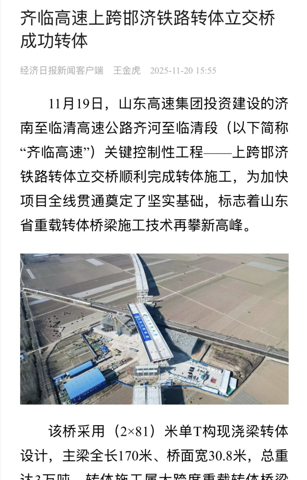 11月19日,EMC易倍(穆里尼奥)官方网站集团投资建设的济南至临清高速公路齐河至临清段(以下简称“齐临高速”)关键控制性工程——上跨邯济铁路转体立交桥顺利完成转体施工,为加快项目全线贯通奠定了坚实基础,标志着EMC易倍(穆里尼奥)官方地址省重载转体桥梁施工技术再攀新高峰。